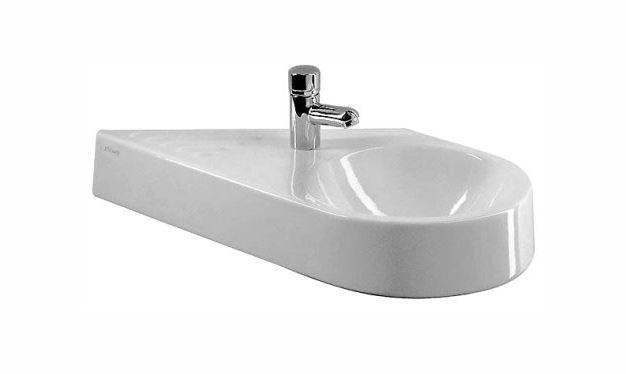 diagonales Modell, ohne Überlauf, mit Hahnlochbank, mit integrierter Keramikablage, Unterseite glasiert, Becken rechts