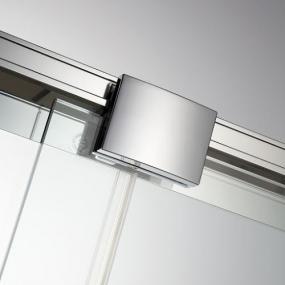 Die neue Ganzmetall-Türführung verbindet das feststehende Glaselement sicher mit dem Boden. Das Türteil wird darüber sicher und sanft an dem Festelement vorbei geführt. Der bewußte Verzicht auf eine untere Führungsschiene ermöglicht einen schwellenlosen Zugang.