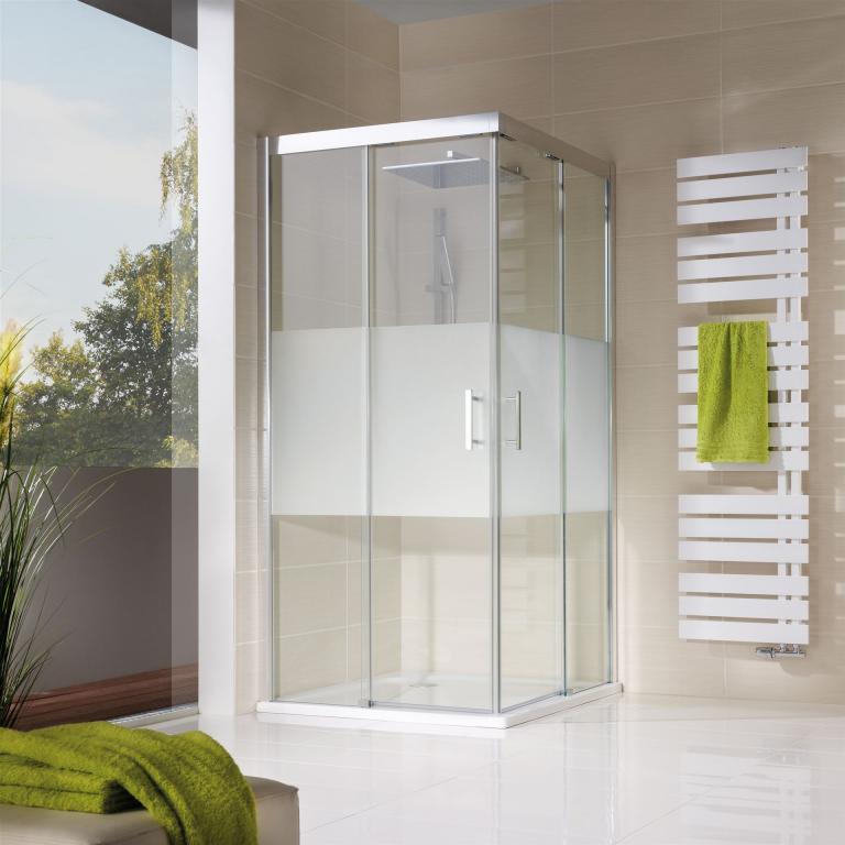 Dieser Eckeinstieg besteht aus zwei sanft gleitenden Türelementen und zwei Festelementen, eingerahmt von einem hochwertigen Profil. Dies ist in den Farben chromoptik und alu silber-matt lieferbar. Ideal auch: die Kombination mit einem der attraktiven HSK-Glasdekore.