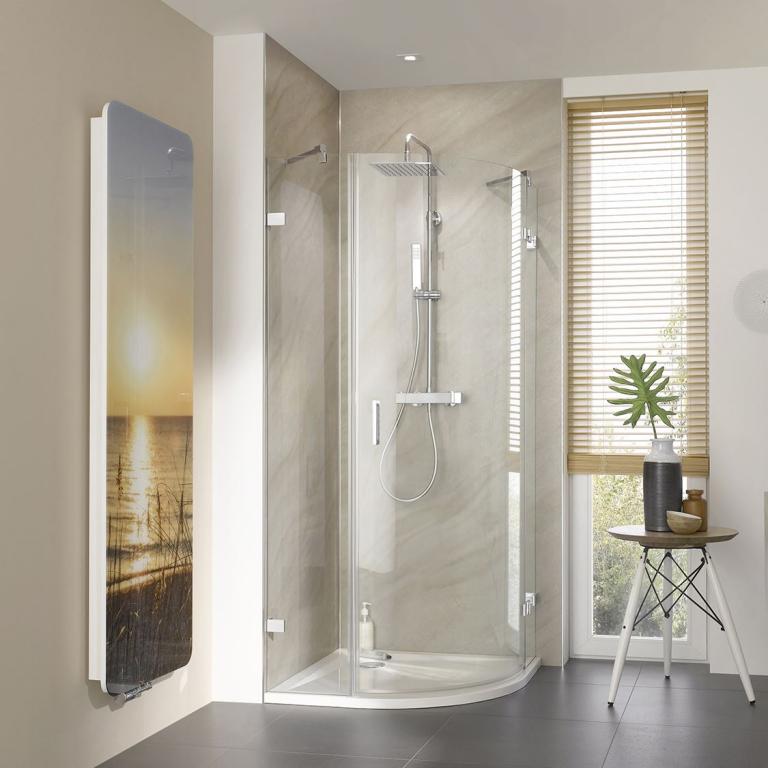 Auch unsere Runddusche ist perfekt für die Raumecke und punktet mit ihrem großzügigen Einstieg. Perfekt für die Wand: HSK-RenoDeco mit viel Auswahl bei den Dekoren. Ganz individuell wird das Bad mit dem bedruckbaren MyGlass-Designheizkörper.