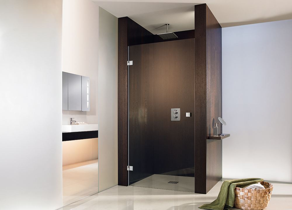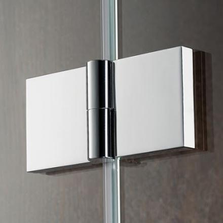 Eine besonders edle Lösung für Nischen bis zu einem Meter Breite bietet diese rahmenlose Drehtür. Das 8 mm starke Türelement öffnet nach außen. Die innen glasbündigen Scharniere tragen es zuverlässig. Ein hochwertiger Magnetanschlag lässt die Tür sicher schließen.