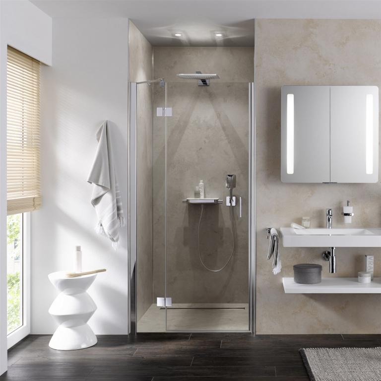 Das neue Aperto-Scharnier punktet mit seiner Großzügigkeit – die Duschtür lässt sich nach außen und innen pendeln. Dabei sind Griffe, Scharniere, Wandprofile und Stabilisationsbügel im frischen und soften Design perfekt aufeinander abgestimmt.
