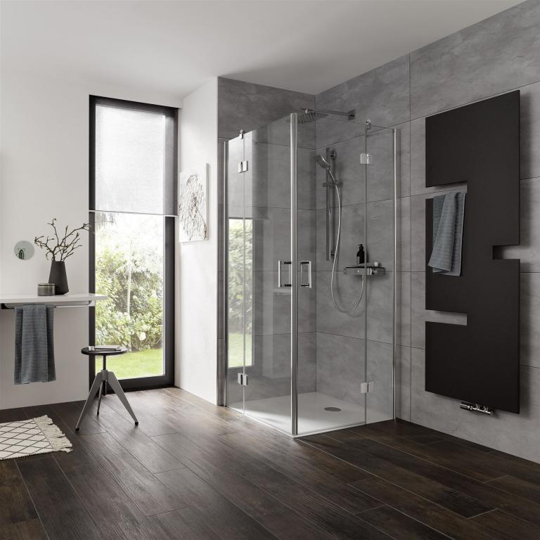 Komfortabel Das neue Aperto-Scharnier punktet mit seiner Großzügigkeit – die Duschtür lässt sich nach außen und innen pendeln. Dabei sind Griffe, Scharniere und Stabilisationsbügel im frischen Design aufeinander abgestimmt.
