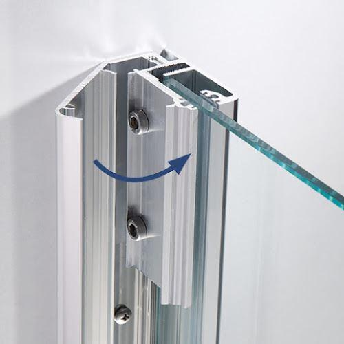 Ideal konstruiert: die optischen Vorzüge einer rahmenlosen Dusche mit den praktischen Möglichkeiten eines Wandprofils. Kugelgelagerte Laufrollen führen das 8 mm Türelement leichtgängig hinter das Festteil dieser Nischenlösung. Mit dem modernen Profil lassen sich schräge Wände bis zu 20 mm ausgleichen und damit aufwändige Sondermaße vermeiden.