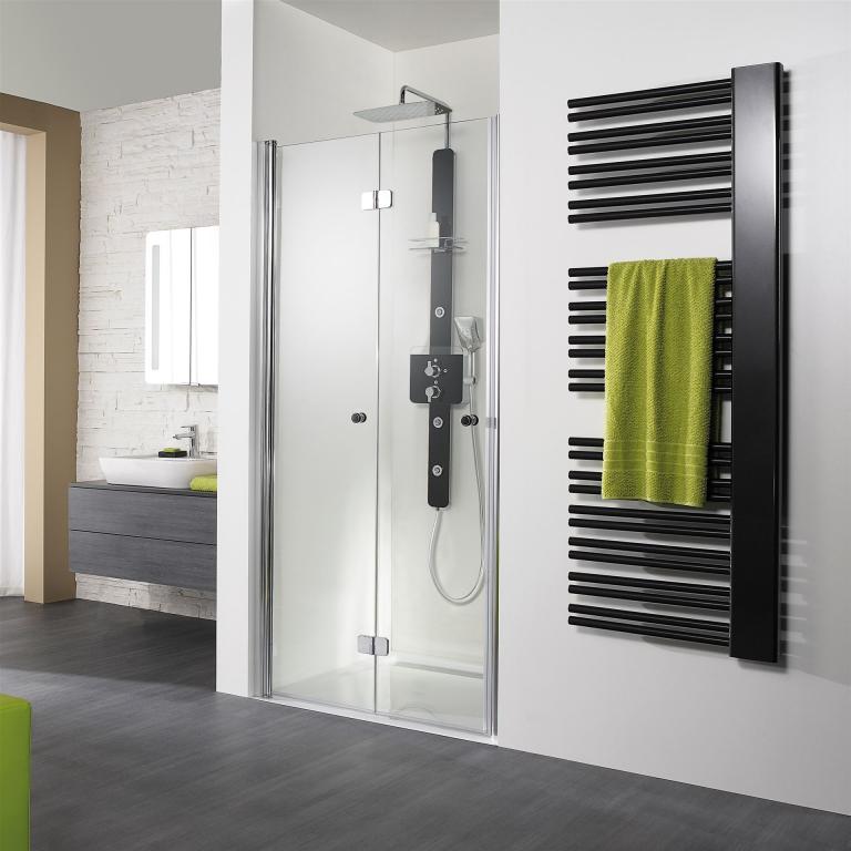 Drehfalttüren sind auch für Raumnischen (max. 120 cm Breite) eine perfekte Lösung. Das komplette Wegdrehen der gefalteten Türelemente ermöglicht einen komfortablen Einstieg. Die Pflege wird durch die innen glasbündigen Scharniere erleichtert, die Handhabung durch den optional zusätzlichen Drehfalttürgriff.