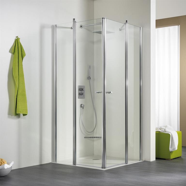 Mit ihren feststehenden Seitenelementen passt sich diese Glasdusche auch schwierigen Raumsituationen an. Seitlich, neben der Abtrennung hervorstehende Wände oder Heizkörper sind kein Hindernis. Neben vielen weiteren Profilfarben ist diese Duschabtrennung auch mit den Strukturgläsern „Chinchilla“, „Carré“ und „Perla hell“ erhältlich.