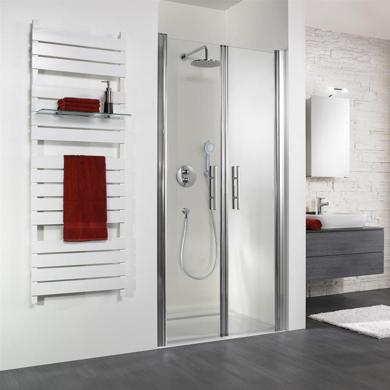 Diese 2-teilige Nischenlösung ist perfekt für verwinkelte Bäder. Der integrierte Heb-/Senk- Mechanismus lässt die Türflügel leicht nach außen und innen schwingen und macht diese Echtglasdusche zu einer tollen Lösung für die ganze Familie.