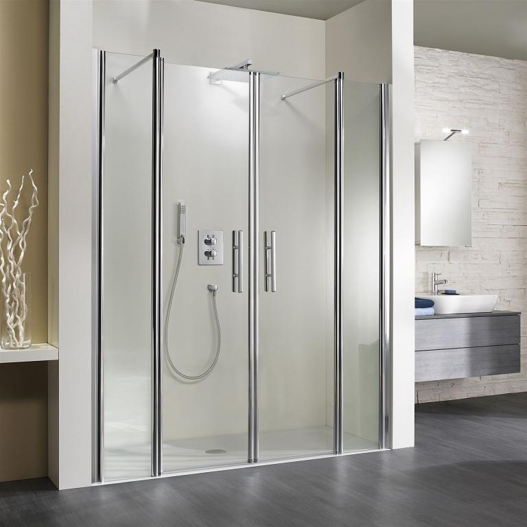 Komfortable Einstiegsmaße für breite Nischen bis maximal 200 cm bietet diese Pendeltürlösung. Die beiden Festelemente an den Seiten können individuell an das Badezimmer angepasst werden.