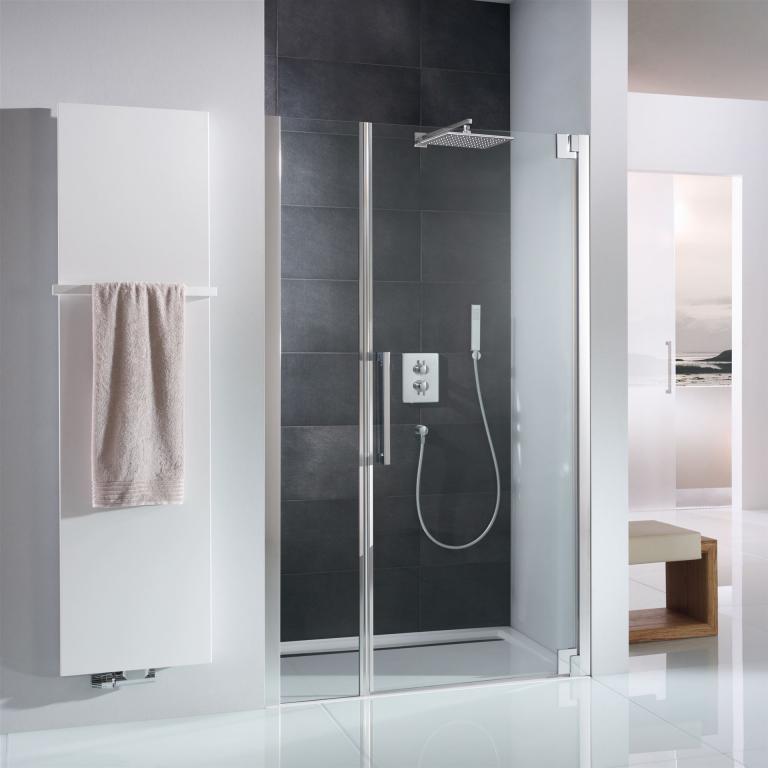 Die K2P-Duschtür wird mit einem Seitenteil kombiniert, und ist somit die perfekte Lösung für große Nischen. Der edle K2-Pendelbeschlag trifft auf die geclipsten K2P-Profilblenden. Bauseitige Ungenauigkeiten an den Wänden sind damit kein Problem. Für optimales Schließen sorgt eine hochwertige Chrommagnet-Leiste.