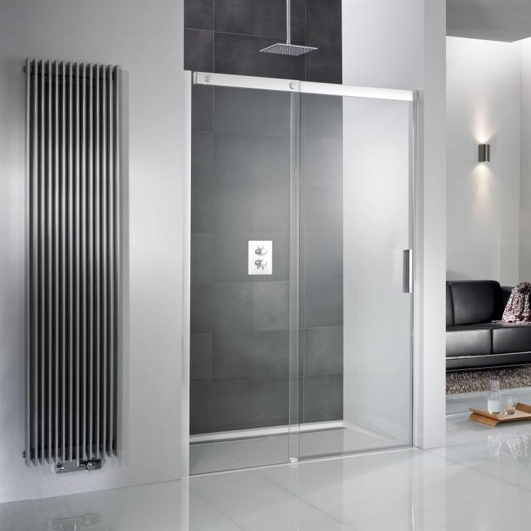 2-fach designprämiert: Die 8 mm starken Glaselemente der K2P Gleittürlösungen gleiten leise und leicht auf kugelgelagerten Rollenwagen in einer komplett geschlossenen Gleitschiene.