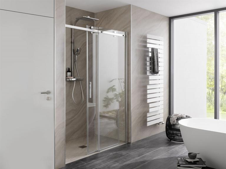 Das neue Gleittür-Modell der beliebten Premium Softcube-Serie ist besonders für kleine Bäder ein Highlight. Dank des serienmäßigen Riegelgriffs läuft die Türscheibe komplett hinter das Festteil und garantiert einen großzügigen Einstieg. Dabei findet sich das softe Design in allen Elementen wieder – von den Clips-Profilen bis zum Griff. Praktisch ist das Clips-Profil auch, da sich damit schräge Wände bis 20 mm einfach ausgleichen lassen.