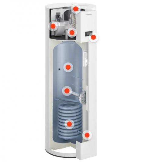 Die Warmwasser-Wärmepumpe ist wahlweise ohne Rohrwendel-Wärmetauscher (TypTOE-ze) für den monovalenten Betrieb erhältlich oder mit integriertem Rohrwendel-Wärmetauscher (TypTOS-ze) zur Nachheizung über einen Heizkessel oder eine Solaranlage. Der trockene, sehr verkalkungsarme Elektro-Heizeinsatz kann ohne Speicherentleerung ausgetauscht werden (bei Typ TOE-ze vormontiert, bei TYP TOS-ze Zubehör).