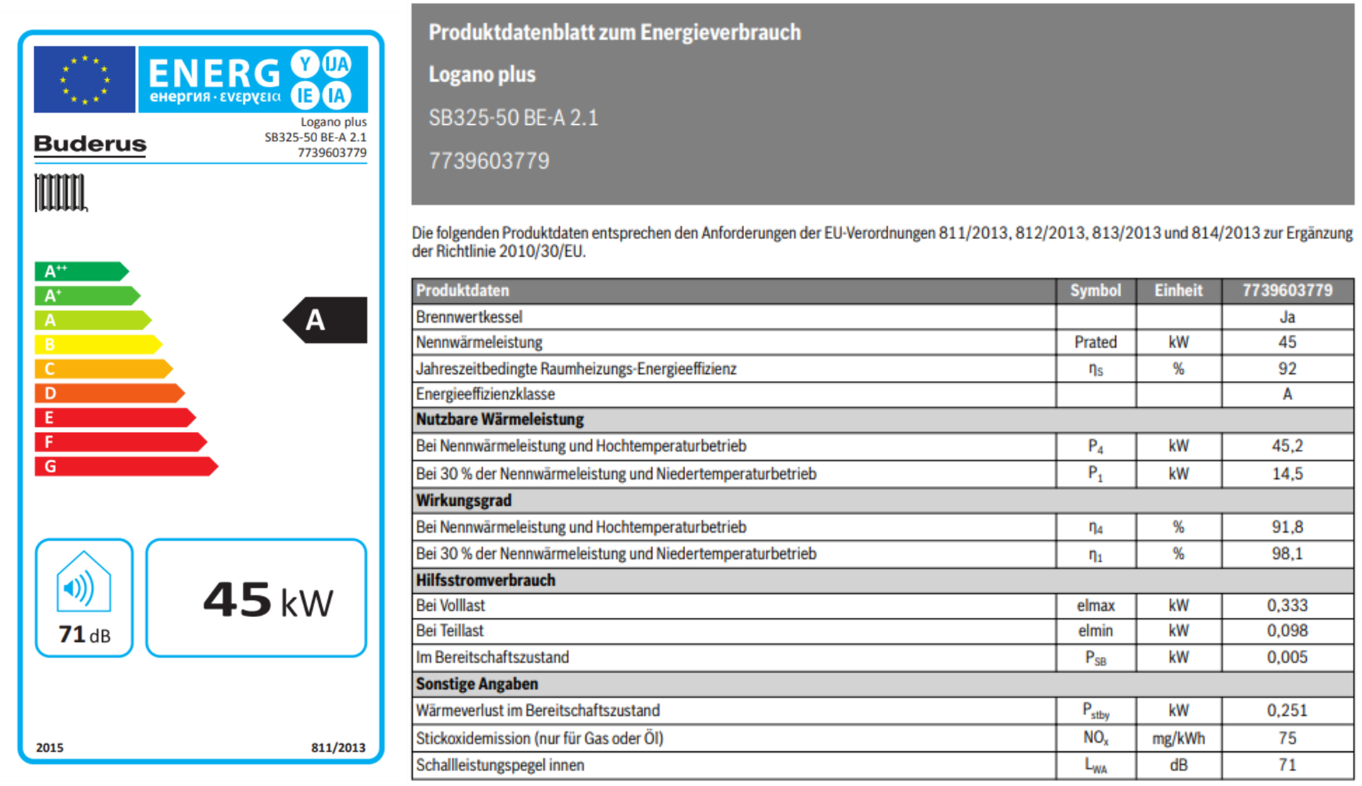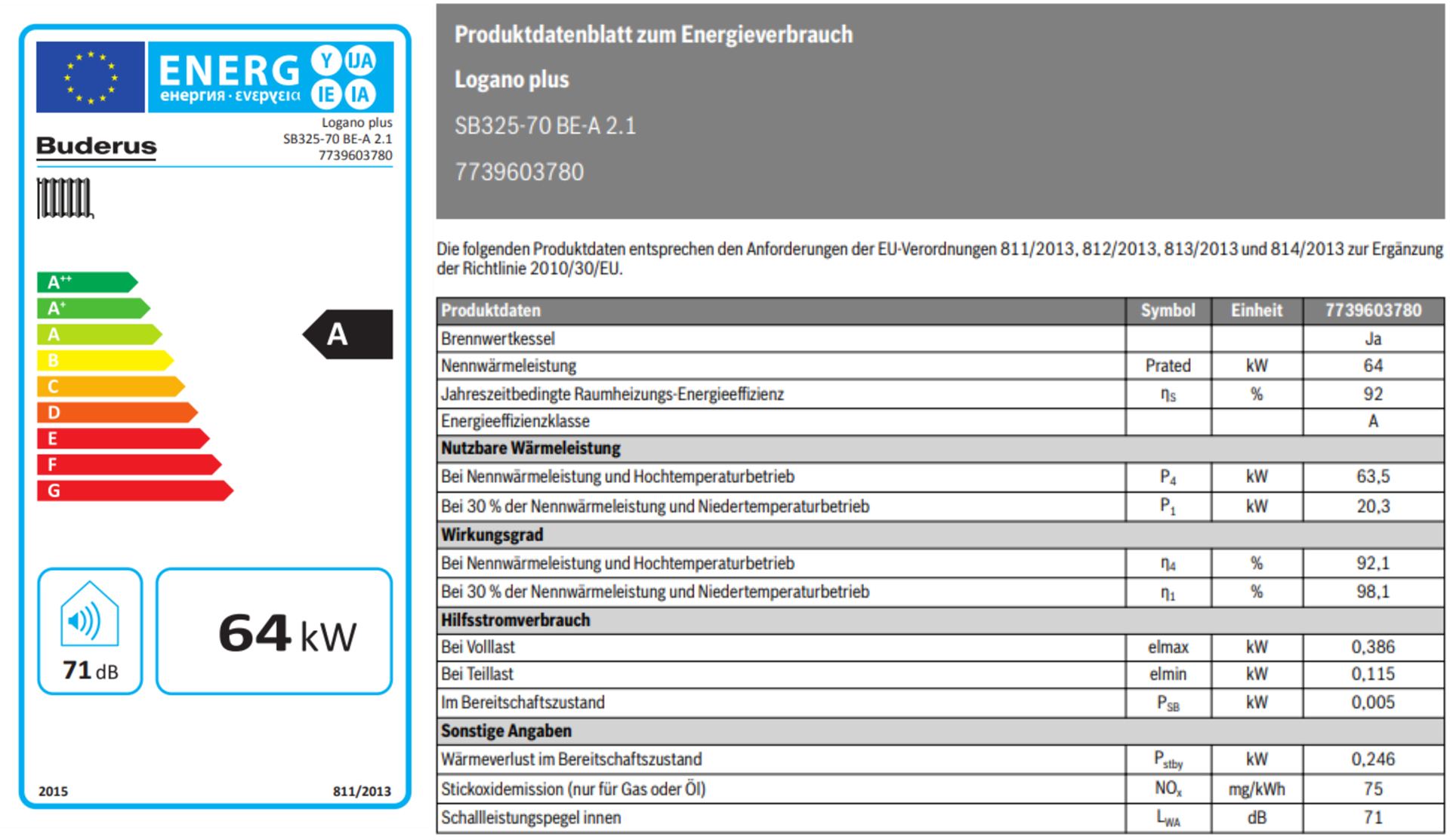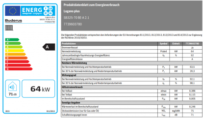 1) Raumheiz-Energieeffizienz ns bei SB325 bis 70kw von bis zu; Teilastwirkungsgrad gem. EU-Verordnung 813/2013 bei SB325 über 70kW von bis zu