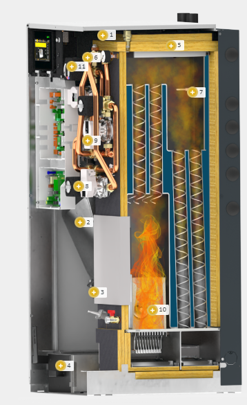 1. Saugturbine 2. Vorratsbehälter 3. Zellradschleuse als Rückbrandschutzeinrichtung 4. Automatische Ascheaustragung in die Aschebox 5. Lambdasonde 6. Sicherheitsarmaturen 7. Partikelabscheider 8. Mischer 9. Pumpe 10. Brennkammer 11. Heizkreis-