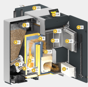 Dieser zündet sowohl im Stückholz- als auch im Pelletsbetrieb selbständig – wenn kein Stückholz eingelegt ist, werden Pellets vollautomatisch zugeführt.