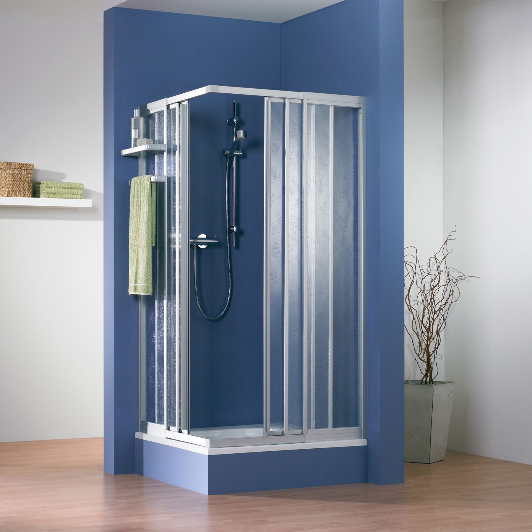 Das hintereinander Schieben der 3-teiligen Türflügel sorgt für einen bequemen Einstieg – auch bei kleinen Wannenmaßen. Das Standardmaß ist für Duschwannen von 75 cm bis 90 cm nutzbar. Diese Duschlösung ist mit hochwertigem Kunstglas und Aluminium-Profilen ausgestattet sowie einem praktischen Handtuchhalter und der funktionalen Utensilienablage ausgestattet.