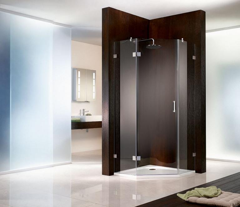 Diese dreiteilige Duschabtrennung ist perfekt für komplizierte Raumsituationen, bei denen z. B. Heizkörper an den Seiten das komplette Öffnen von größeren Türen verhindern würden. Die fünfeckige Form passt besonders gut in Kleinbäder.