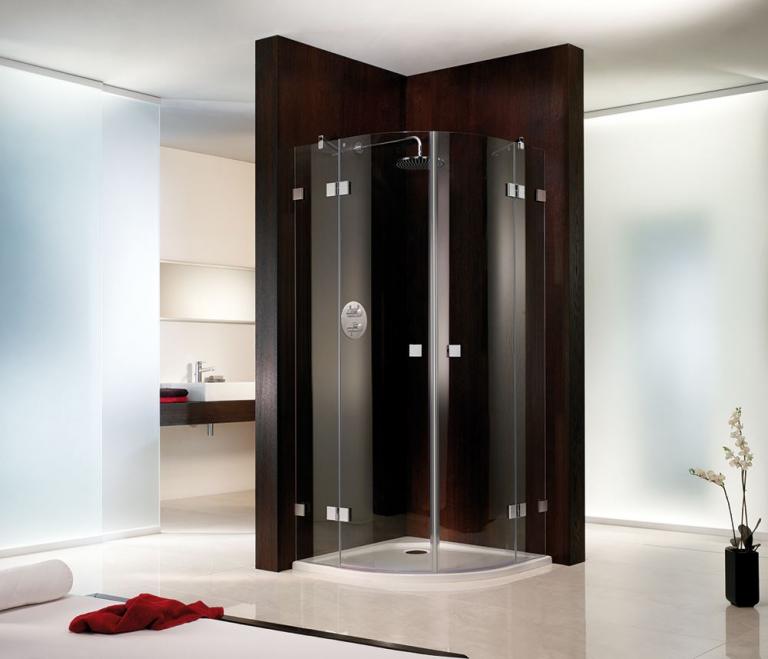 Diese Variante mit runden Türen ist wie gemacht für Raumecken. Zwei feststehende Seitenteile erlauben die Installation von Heizkörpern oder schmalen Badmöbeln angrenzend an die Dusche. Beide Drehtüren öffnen nach außen.