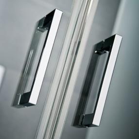 Bei dieser designprämierten K2-Lösung läuft die edle 8 mm starke Echtglastür sanft hinter das feststehende Element. Mit Hilfe des neuen, optional wählbaren, 24 cm lange Ganzmetall-Riegelgriffs öffnet sich die Tür maximal und vergrößert den Einstiegsbereich um 30 - 40 mm Breite. Die Drehfalttür wird zusammengefaltet und dann nach innen oder außen an die Wand gedreht. Speziell darauf abgestimmt: der gepufferte Drehfalttür-Griff.