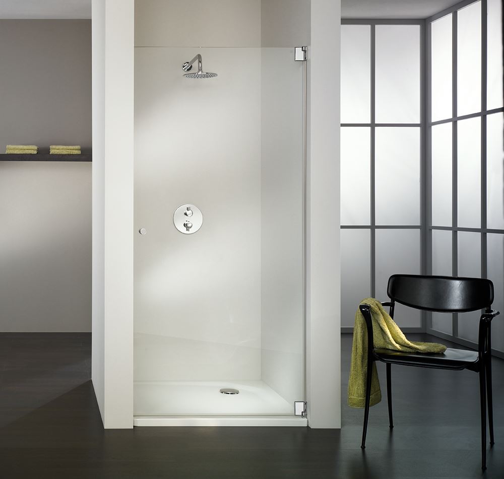 Die Glasdusche K.01 ist eine Lösung für Nischen bis zu einem Meter Breite. Die Drehtür wird direkt an der Wand befestigt. Durch den 180°-Beschlag lässt sich die Tür komfortabel nach innen und außen öffnen.