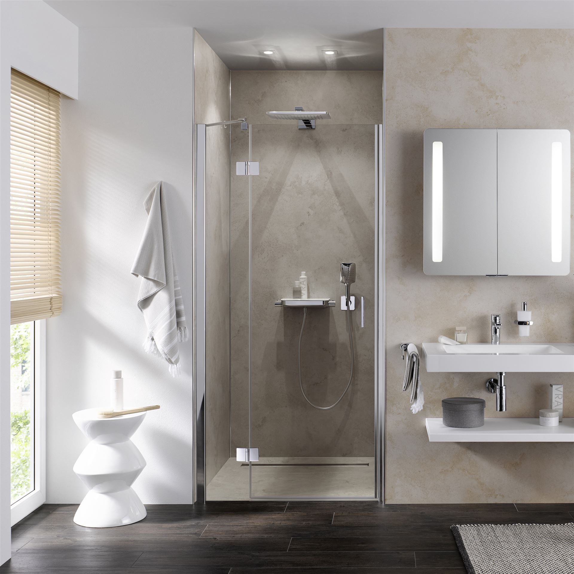 Komfortabel Das neue Aperto-Scharnier punktet mit seiner Großzügigkeit – die Duschtür lässt sich nach außen und innen pendeln. Dabei sind Griffe, Scharniere und Stabilisationsbügel im frischen Design aufeinander abgestimmt.