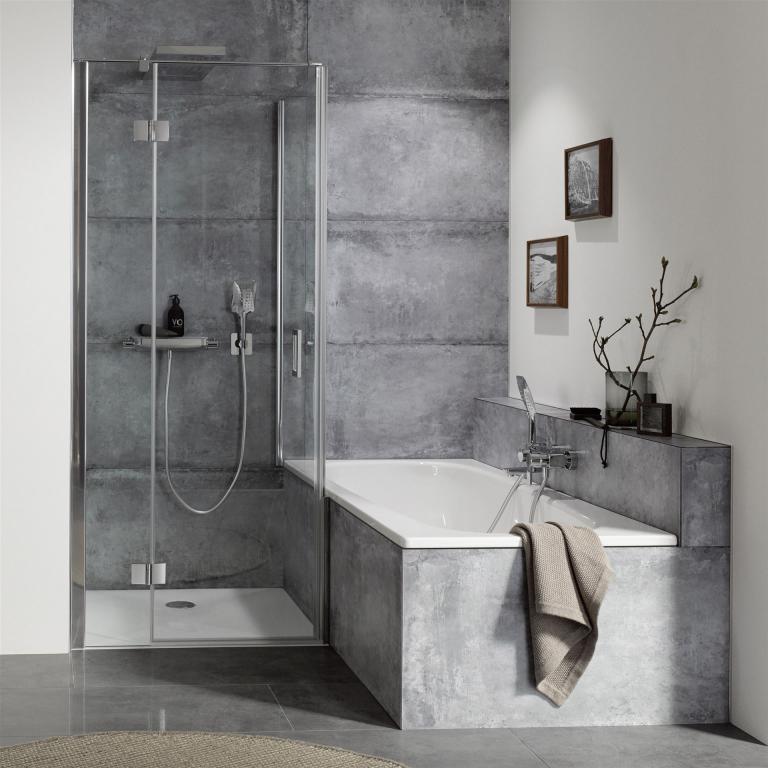 Besonders platzsparend für die Raumecke in kleinen Bädern präsentiert sich die Pendeltür mit verkürzter Seitenwand. Für optimalen Duschspaß auf wenig Raum sorgen die AquaTray-Armatur als Unterputzvariante in Kombination mit der Lavida Schwallbrause.