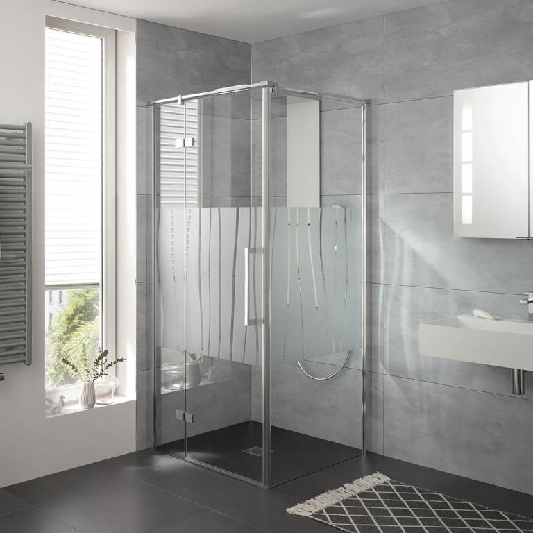 Viel Komfort, auch auf wenig Raum, bietet die Drehtür mit Seitenwand. Die optionale Glasmattierung Linea.01 setzt ein optisches Highlight und ist zugleich ein zeitlos-moderner Sichtschutz.