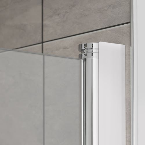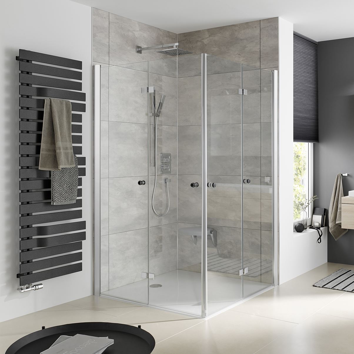 Für einen maximal großen Einstieg sorgen Drehfalttüren. Sie können zusammengefaltet und nach innen oder außen gedreht werden. So sparen sie jede Menge Platz. Die beidseitigen Puffergriffe geben die nötige Sicherheit. Noch edler wirkt die Duschkabine mit RenoDeco-Platten und Dekoren ganz nach Ihrem Geschmack.