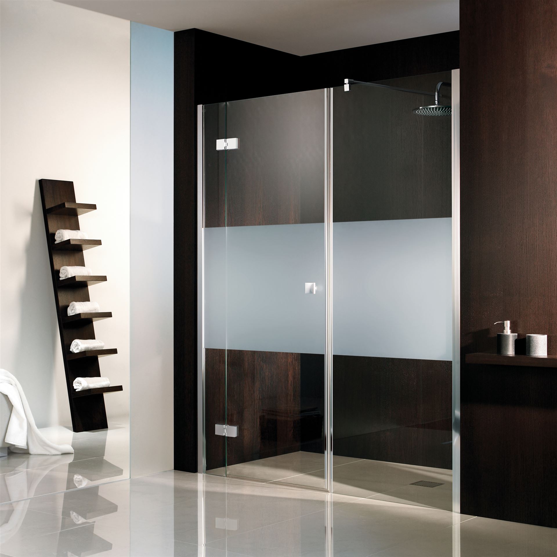 Diese elegante Nischenlösung mit eckigen, innen bündigen Scharnieren, markantem Griff sowie einer weit öffnenden Drehtür lässt Raum für unvergleichlichen Duschspaß. Im Trend die edle Glasmattierung – ob als zusätzliches Designelement oder dezenter Sichtschutz. Ein weiterer Vorteil dieser Lösung ist die bodengleiche und damit barrierefreie Montagemöglichkeit. Sie bietet einen ungehinderten Zugang ohne Hindernisse.