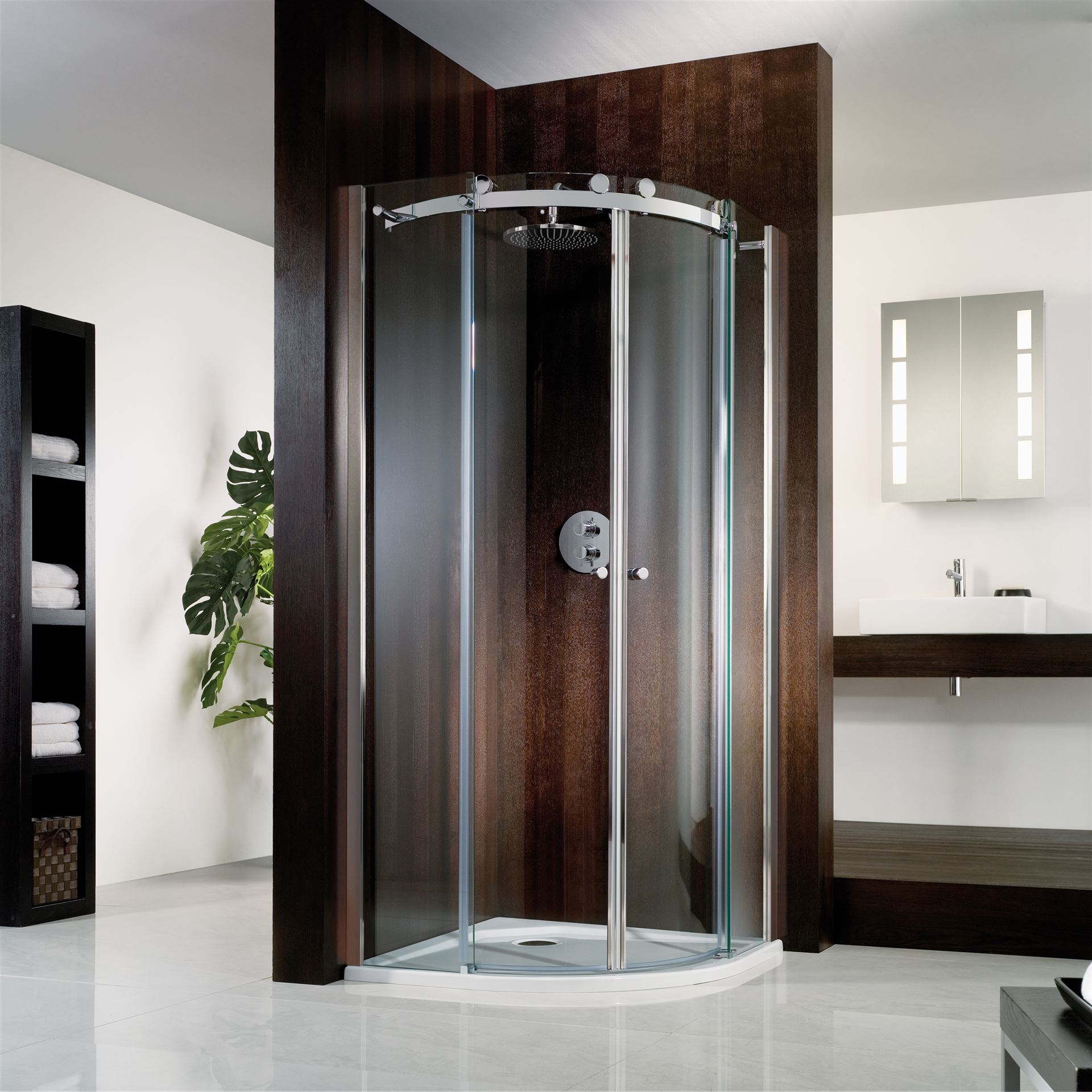 Diese exklusive Rundduschlösung begeistert durch sanftes Gleiten der hochwertigen Türelemente und besticht optisch durch hochwertige Oberflächen. Die massiven Griffe gleiten mit den Türen vollständig hinter die Seitenteile und sorgen so für einen großzügigen Zugang.