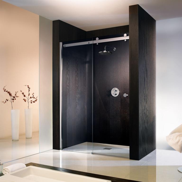 Ideal konstruiert: die optischen Vorzüge einer rahmenlosen Dusche mit den praktischen Möglichkeiten eines Wandprofils. Kugelgelagerte Laufrollen führen das 8 mm Türelement leichtgängig hinter das Festteil dieser Nischenlösung. Mit dem modernen Profil lassen sich schräge Wände bis zu 20 mm ausgleichen und damit aufwändige Sondermaße vermeiden.