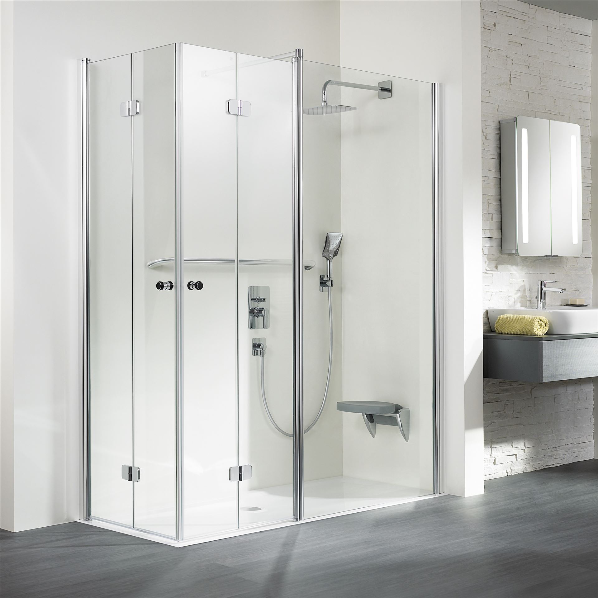 Die weit öffnenden Türflügel der Exklusiv Drehfalttürlösungen ermöglichen einen komfortablen Zugang zur Duschzone – auch bei weniger tiefen Duschbereichen. Hier wurde die Badewanne einfach durch eine neue 170 x 70 cm große Dusche ersetzt. Auf Wunsch kann ein zweiter Drehfalttürgriff an den Türelementen die Bedienung noch mehr erleichtern.