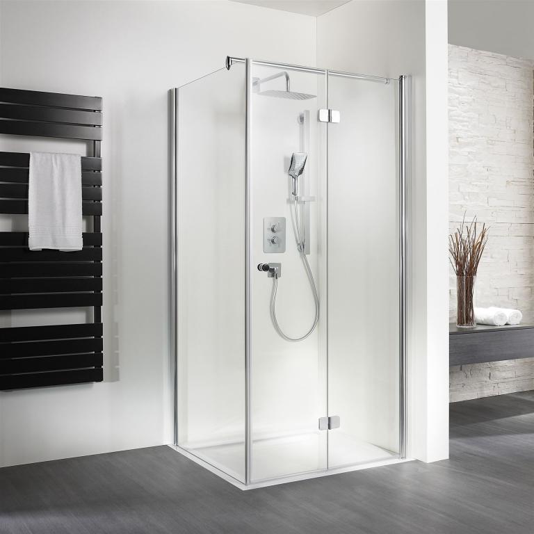 Die unterschiedlichsten Drehfalttürlösungen der Serie Exklusiv bieten einen großen Einstieg bei geringem Platzbedarf. Die Türelemente lassen sich komplett und einfach nach innen und außen falten. Die soliden Stabilisationsbügel halten die Echtglas-Seitenwände zuverlässig und sicher.