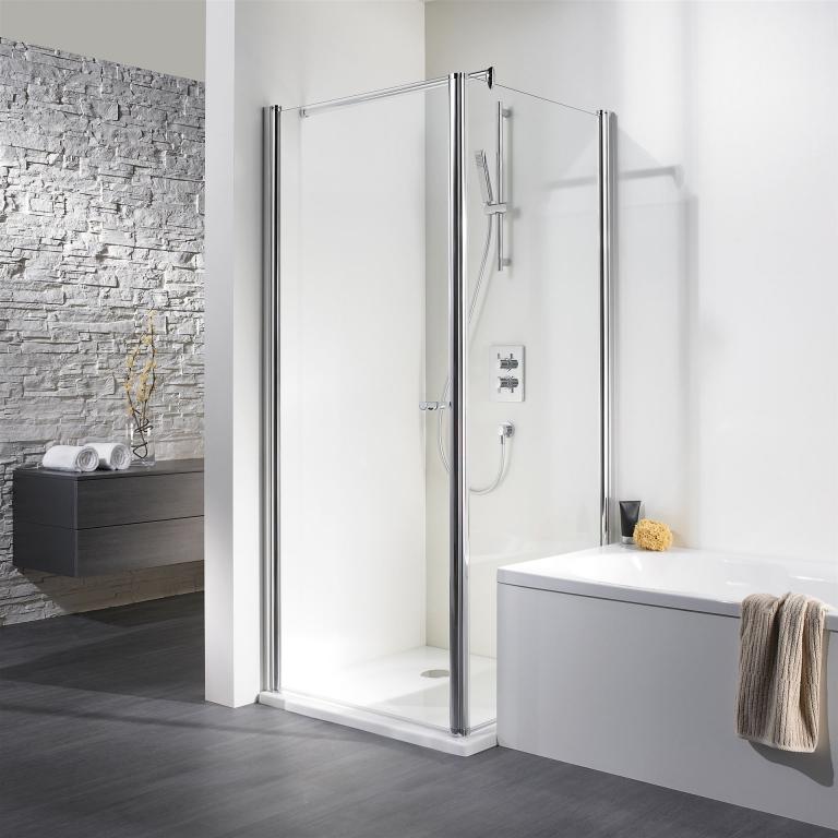 Grenzt die Badewanne direkt an die Duschabtrennung, kommt es häufig zu Problemen bei der Pflege der Glaselemente. Deshalb ist diese Duschlösung mit einer wegschwenkbaren Seitenwand ausgestattet. Das ermöglicht eine einfache Reinigung des kompletten Glases.