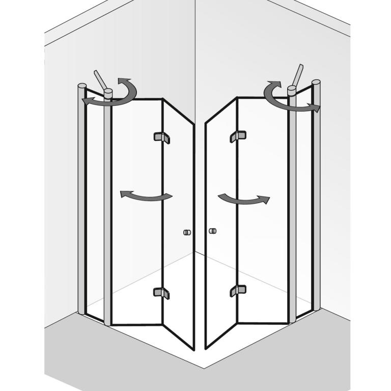 Besonders großzügig und bis zu 120 x 120 cm lieferbar: Der Eckeinstieg aus der Drehfalttürmodellpalette. Der speziell entwickelte Griff ist mit einem funktionalen Gummipuffer ausgestattet. Er verhindert das harte Anschlagen ans Glas und macht den Griff auch mit feuchten Händen rutschsicher. NEU: ein zusätzlicher, optionaler Griff am wandangeschlagenen Türteil. Er erleichtert die Bedienung in der Dusche und macht die Handhabung noch sanfter.