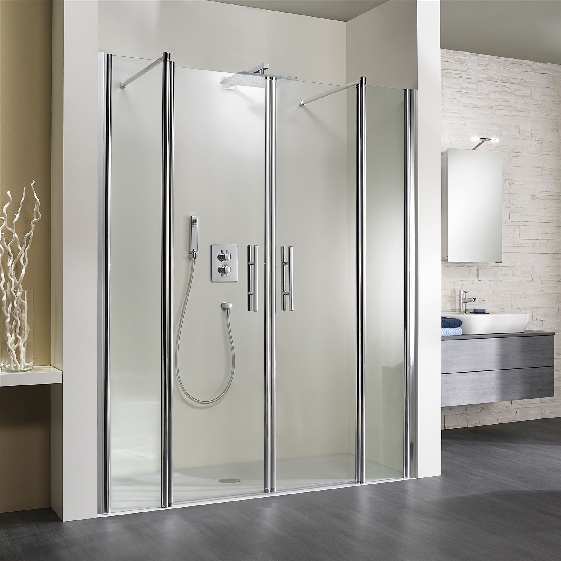 Komfortable Einstiegsmaße für breite Nischen bis maximal 200 cm bietet diese Pendeltürlösung. Die beiden Festelemente an den Seiten können individuell an das Badezimmer angepasst werden.