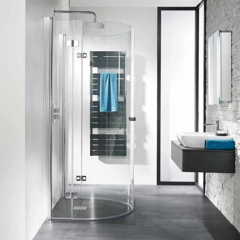 Weit öffnende Türelemente, kombiniert mit minimalem Raumbedarf, bietet diese zusammenfaltbare Exklusiv-Halbkreisdusche. Die praktische Drehfalttürlösung schafft einen großzügigen Duschbereich, der nach dem Duschen zur zusätzlichen Wellnessfläche im Bad wird – besonders komfortabel in kleinen Bädern.