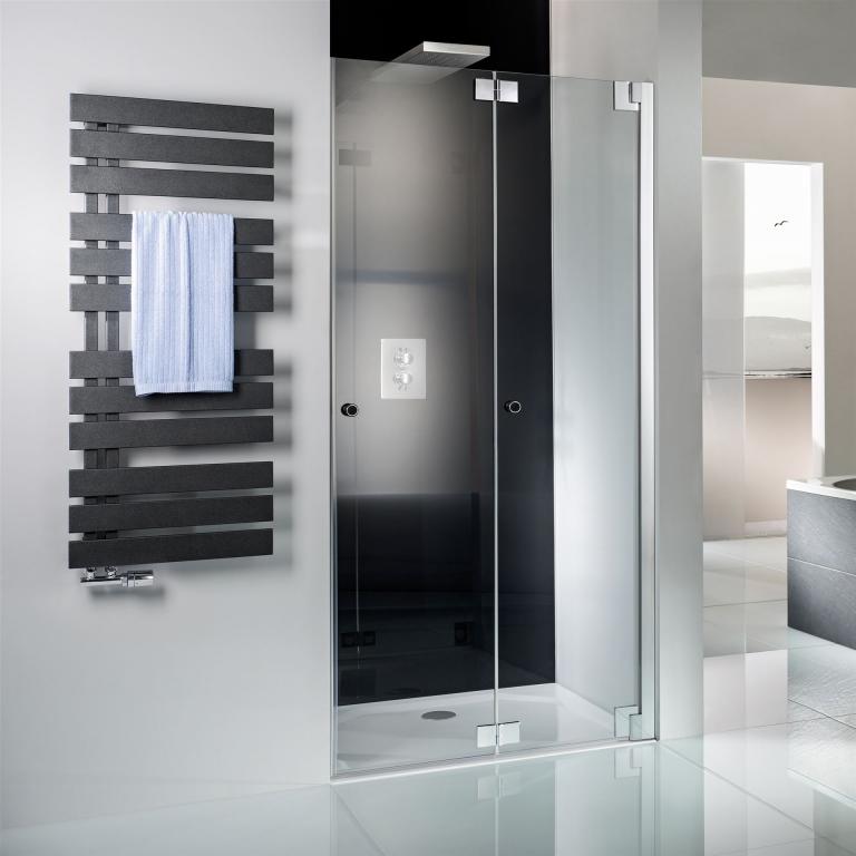 Mit dieser Drehfalttürlösung bietet die 8 mm Serie K2P eine komfortable Möglichkeit, die edlen Türen auch in einer Nische flach und damit platzsparend zusammen zu falten um sie dann maximal weit nach innen oder außen zu drehen. Ein zweiter Griff (optional) erleichtert das Handling und verhindert das Anschlagen.
