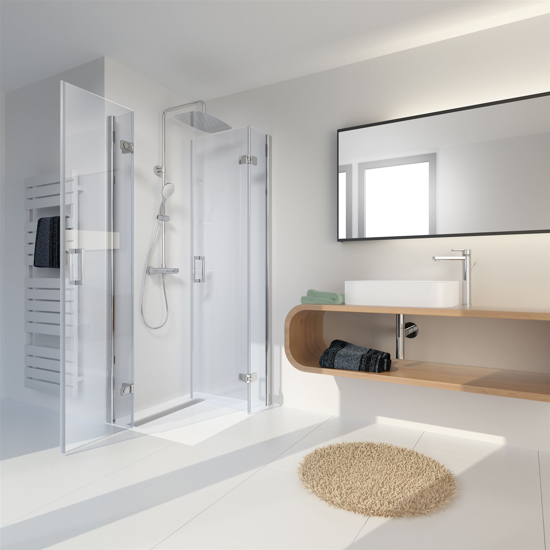 Pflegeleichte Pendeltürlösungen: Egal, ob in der Raumecke oder einer Nische: Diese Türen lassen sich nach außen und innen öffnen. Das bietet einen großzügigen Einstieg und zusätzlichen Komfort. Nach dem Duschen können die Türen nach innen gestellt abtropfen und trocknen. Besonders pflegeleicht sind die glasbündigen Pendelscharniere.
