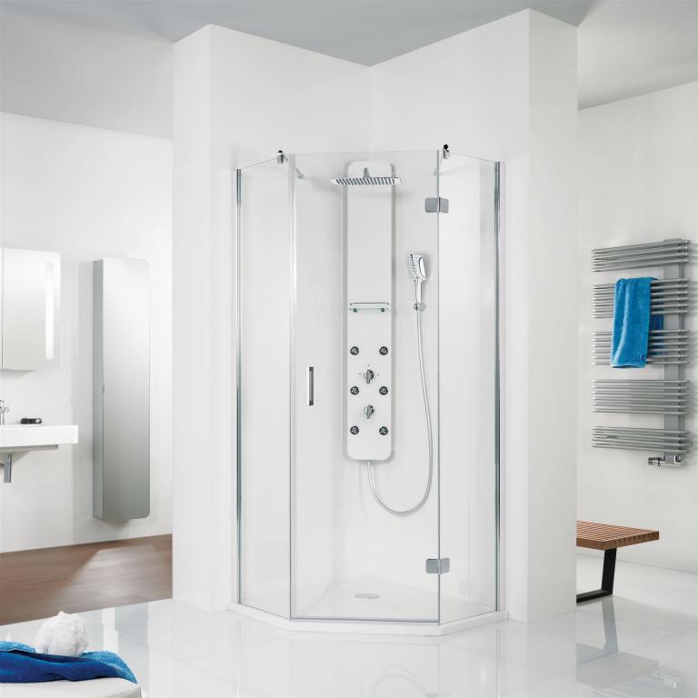 Sachlich-modern und platzsparend ist diese Lösung für die Raumecke in kleinen Bädern. Die Tür wird sicher von einem Festelement gehalten und schließt zuverlässig mit dem Magnet- Dichtprofil am zweiten Element. Für luxuriösen Duschkomfort sorgt das Softcube Duschpaneel.