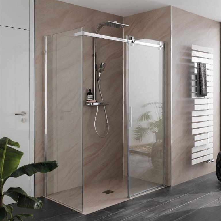 Das neue Gleittür-Modell der beliebten Premium Softcube-Serie ist besonders für kleine Bäder ein Highlight. Dank des serienmäßigen Riegelgriffs läuft die Türscheibe komplett hinter das Festteil und garantiert einen großzügigen Einstieg. Dabei findet sich das softe Design in allen Elementen wieder – von den Clips-Profilen bis zum Griff. Praktisch ist das Clips-Profil auch, da sich damit schräge Wände bis 20 mm einfach ausgleichen lassen.