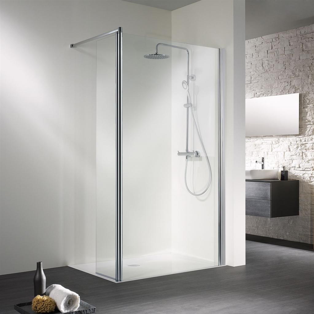 Großzügigen Zugang und viel Bewegungsfreiheit plus zusätzlichen Spritzschutz bietet das um 90° nach innen und außen pendelbare Seitenteil dieser soliden Walk In- Abtrennung. Hohe Stabilität erhält diese durch den ausgeprägten Stabilisationsbügel. Die große Sicherheitsglas-Auswahl, wie u. a. Grauglas und Spiegelglas, ermöglichen ein individuelles Gestalten des ansonsten stark reduzierten Designs.